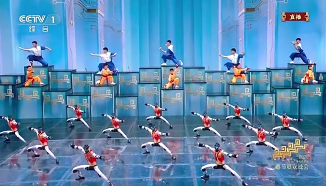 今年的《武BOT》,科技与传统硬核碰撞,一排排机器人舞台上,动作行云流水,跳马、后空翻,挥拳扫腿动作连贯、招招精准,还和塔沟武术学校小朋友们展开“人机对决”双方对练棍术、耍双节棍醉拳。