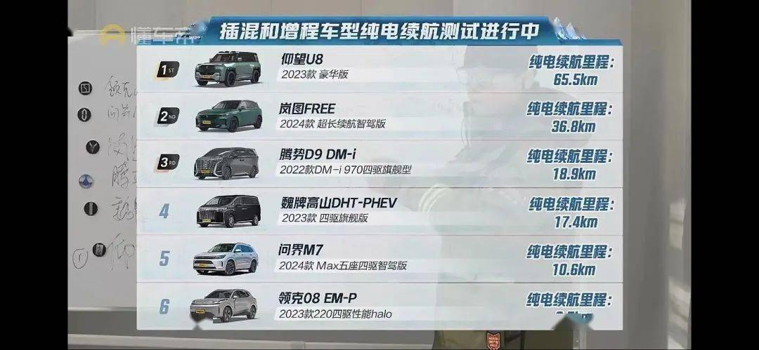 测试的项目,选的自然也是网上争议最大的插混车型纯电续航测试。受测的车辆虽然从将近 20 台减到了 6 台,但像是问界 M7 、领克 08 和仰望 U8 这些争议车型也都悉数登场了。