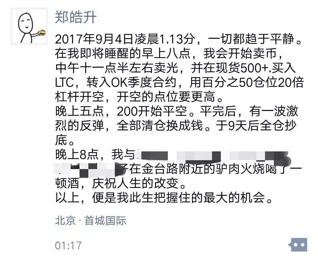 “2017年9月4日凌晨1:13,一切都趋于平静。在我即将睡醒的早上八点,我会开始卖币,中午十一点半左右卖光,并在现货500+.买入LTC,转入OK季度合约,用百分之50仓位20倍杠杆开空,开空的点位要更高。晚上五点,200开始平空。平完后,有一波激烈的反弹,全部清仓换成钱。于9天后全仓抄底。晚上8点,我和朋友们在金台路附近的驴肉火烧喝了一顿酒,庆祝人生的改变。以上,便是我此生把握住的最大的机会。”