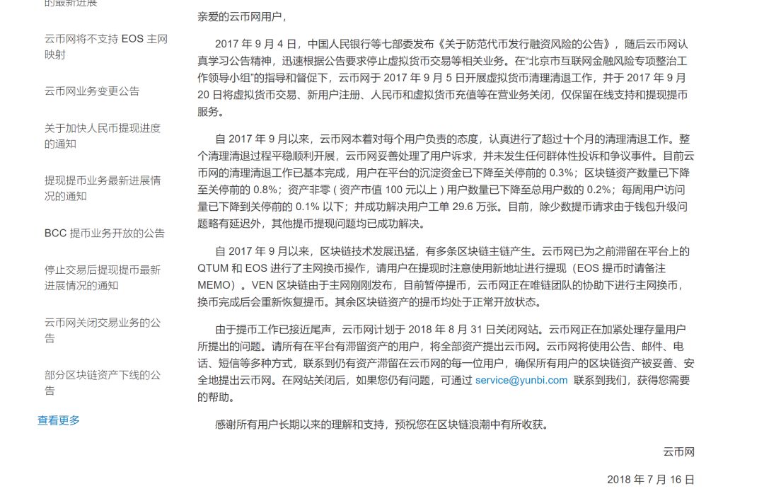 如今,云币网还能打开。在其2018年7月16日公告称,由于提币工作已接近尾声,云币网计划于 2018 年 8 月 31 日关闭网站。