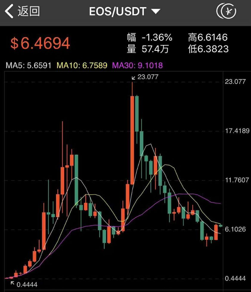 焦宇那1000块的菩提被换成了83个EOS。焦宇回忆那时的EOS,价格大概为11元9毛8分。很快,大瀑布冲得EOS不到3元。焦宇面临着选择,退出止损或是持有等待。他选择了后者。并在随后的将近三个月的大牛市里,等来了EOS的上涨。