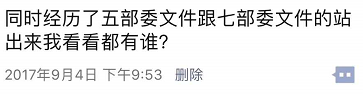 图上内容,是一条发自于2017年9月4日的朋友圈,内容为“同时经历了五部委文件跟七部委文件的站出来我看看都有谁?”,该条朋友圈点赞甚多,其中不乏行业知名人士。