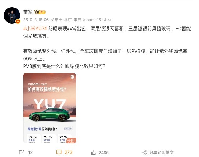 【TechWeb】9月4日消息,小米CEO雷军日前发布一张图表示,了小米YU7在隔绝紫外线方面表现出色。
