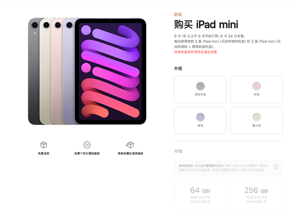 iPad mini 6这次提供了深空灰色、粉色、紫色、星光色四款配色可选,存储容量提供64GB、256GB两种可选,无线局域网版本售价为3799元起,蜂窝版本售价为4999元起。