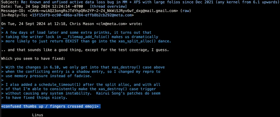 2021年,Linux 内核文件系统中逐步开启了名为 Large Folio 的新特性,目的是提升文件读写性能。理论上,这个特性能让文件系统更快、更高效,但现实却存在bug。