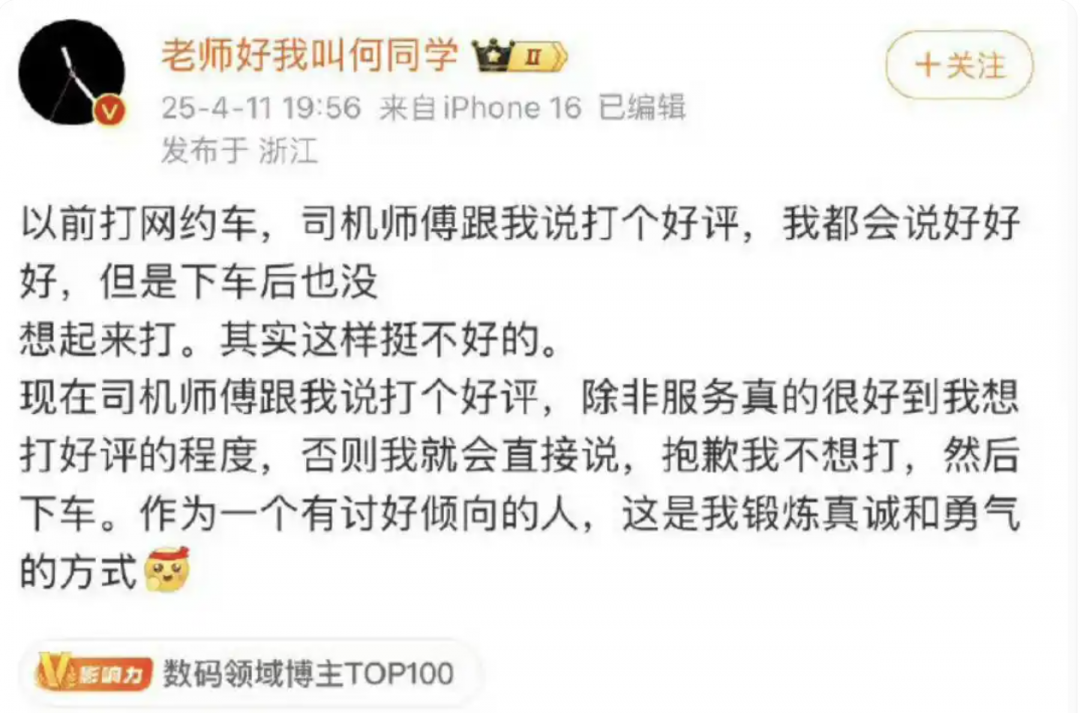他在微博中称:“以前打网约车,司机师傅跟我说打个好评,我都会说好好好,但是下车后也没想起来打。其实这样挺不好的。现在司机师傅跟我说打个好评,除非服务真的很好到我想打好评的程度,否则我就会直接说,抱歉我不想打,然后下车。作为一个有讨好倾向的人,这是我锻炼真诚和勇气的方式。”