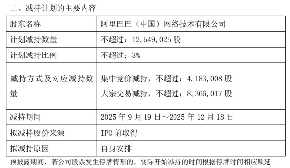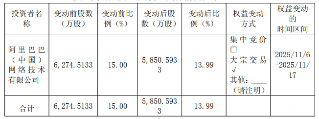 2025 年11 月6 日至2025年 11 月 17 日,阿里巴巴(中国)网络技术有限公司通过大宗交易方式减持公司股份 4,239,200 股,占公司总股本的比例由15.00%减少至 13.99%;