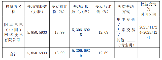 2025年11月24日至2025年12月1日,阿里巴巴(中国)网络技术有限公司通过集中竞价及大宗交易方式减持公司股份 5,439,008 股,占公司总股本的比例由13.99%减少至12.69%。