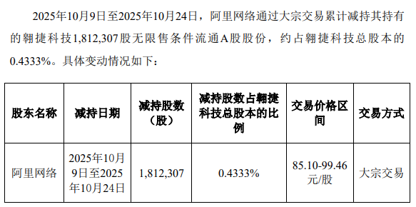 2025年10月9日至2025年10月24日,阿里网络通过上海证券交易系统大宗交易累计减持公司股份1,812,307股,减持比例为0.4333%;