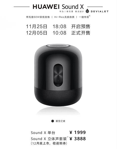 目前,华为Sound X智能音箱在华为Vmall商城、京东、天猫、苏宁易购等各大电商平台已经正式开启预售,单台售价1999元,立体声套装(2台)售价为3888元。