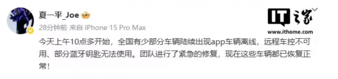 夏一平回应部分极越汽车 App 离线等问题:团队进行了紧急修复,已恢复正常汽车