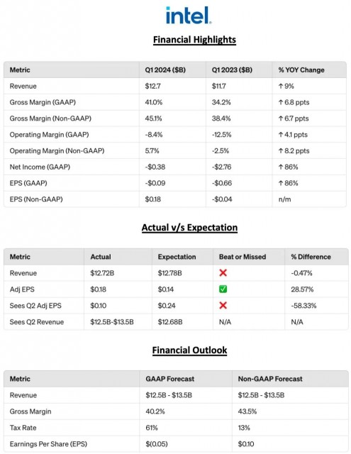 4 月 26 日消息,英特尔本周四公布了 2024 年第 1 季度财报,营收 127.2 亿美元(备注:当前约 922.2 亿元人民币),同比增长 9%,调整后每股收益 18 美分。