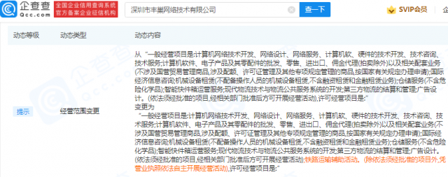 企查查显示丰巢关联公司经营范围新增铁路运输辅助活动快讯