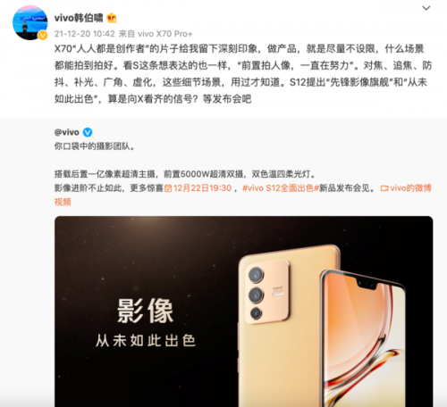 先锋影像旗舰!vivo S12影像配置公布:5000万前置双摄+1亿后置主摄快讯