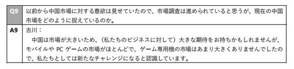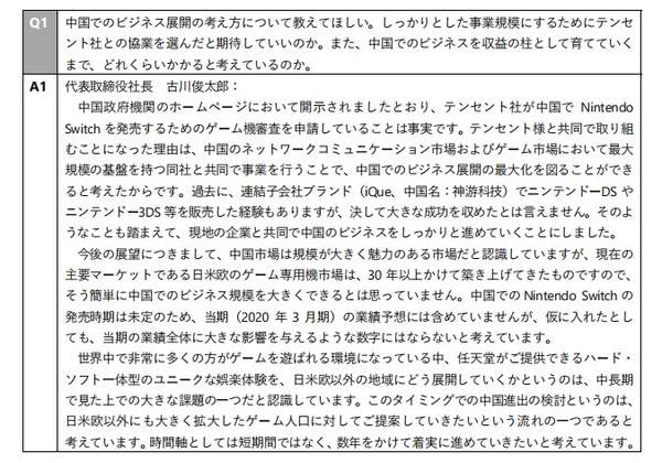 对于需要多长时间才能把在中国的业务发展成收益支柱,古川俊太郎表示中国市场是一个巨大的,有吸引力的市场,但现在主机的主要市场是日美欧,这是花了30年的时间建立起来的。因为Switch在中国的发售日期还未定,所以没有包括到本季度(2020年3月期)的业绩预测内,而即使是包含在内了,也不会给本季度的整体业绩带来很大影响。