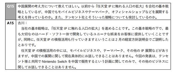 在近日任天堂的决算说明会上,任天堂社长古川俊太郎回答了与腾讯公司合作原因,他表示腾讯在中国拥有最大规模的网络通讯和游戏市场。过去虽然与神游科技合作任天堂3DS等产品,但不能说是取得了巨大的成功。在这样的情况下,任天堂决定与腾讯共同把中国的业务顺利发展进行下去。