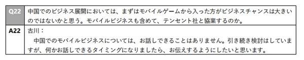 至于在中国市场移动游戏机会很大,是否会与腾讯合作,古川俊太郎表示现在还没法回答,未来会继续探讨,时机成熟会有答案。