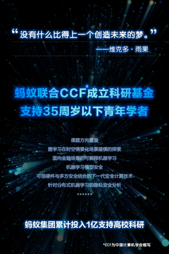 资料显示,CCF成立于1962年,每年举办数百场多规模、多层次学术会议,承担着促进学术界和产业联动等职能。继续支持青年学者在前沿技术尤其是信息技术领域的研究,是蚂蚁同CCF共同设立这一基金会、达成战略合作的初衷。