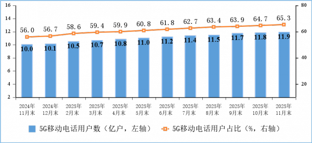 5G用户规模持续扩大。截至11月末,三家基础电信企业及中国广电的移动电话用户总数达18.28亿户,比上年末净增3854万户。其中,5G移动电话用户达11.93亿户,比上年末净增1.79亿户,占移动电话用户的65.3%。