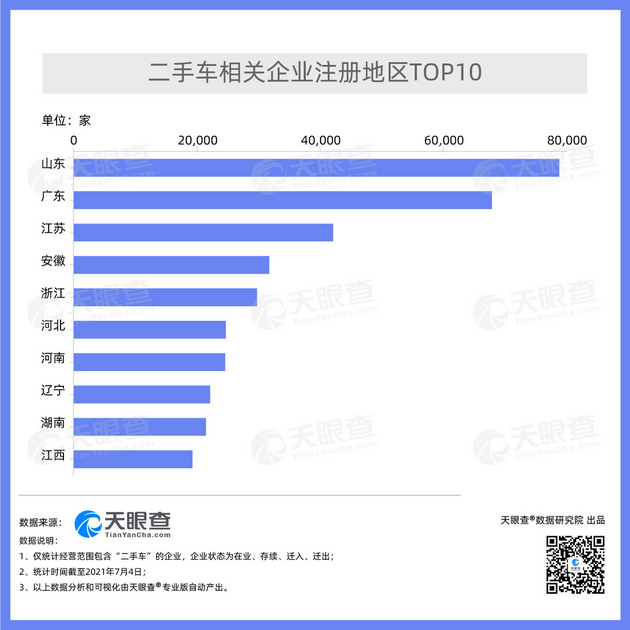 从地域分布来看,二手车相关企业数量最多的是山东省,有7.8万余家企业,占比约13%,其次是广东省,二手车相关企业数量为6.7万余家,占比约11%。