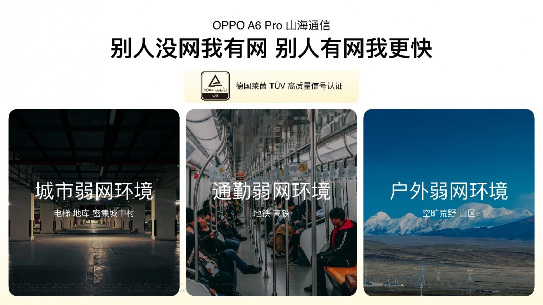 OPPO A6 Pro 采用旗舰级山海通信全套解决方案,带来行业最强弱网通信体验。针对地库、电梯、山区等信号薄弱场景,山海射频天线通过天线设计革新,低频信号收发能力提升 200%,整体信号强度达前代 2 倍。配合山海弱网加速引擎,智能切换最优频段,以及山海无网通信,实现“别人没网我有网,别人有网我更快”的流畅体验,并获得手机行业首个德国莱茵 TÜV 高质量信号认证。
