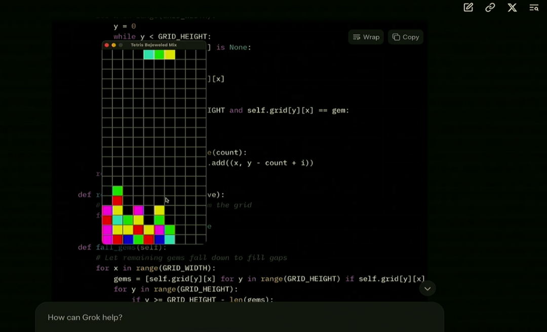 在演示的过程中,马斯克要求使用Grok 3使用pygame组件设计一款游戏,把俄罗斯方块和宝石迷阵缝合到一起。