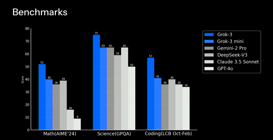 具体表现在Grok3 在 AIME'24(美国数学竞赛)、GPQA(研究生水平科学知识问答能力的基准测试)等测试中均取得了比 Gemini-2 pro、DeepSeek-v3、Claude 3.5 Sonnet 和 GPT-4o 更好的效果。