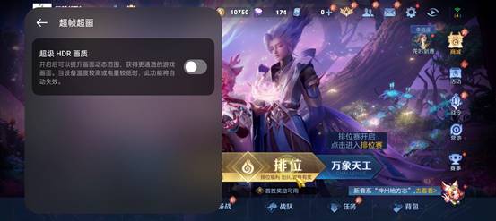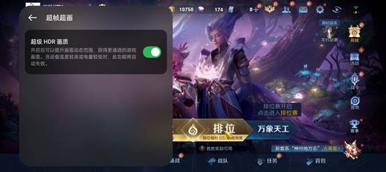 值得注意的是,在打开超级HDR画质后,游戏的画质、光影更加自然真实,皮肤效果更生动,团战技能特效也更炫酷。