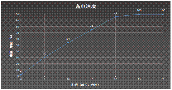 在实际充电测试中,该机5分钟便可充入30%,10分钟可充满54%,完全充满也仅需23分钟,这一充电速度甚至比官方的数据还快一些,可以让你在任何短暂的空余时间轻松将电池充满,解决大部分场景的充电需求,大大缓解电量焦虑。
