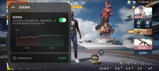 首先我们对《和平精英》进行测试。在将画面设置为超高清+超高帧率并在打开“极限稳帧”功能下,该机在大约30分钟的游戏中帧率表现非常稳定,整个游戏过程中的开关门、射击、开车、切换视角等场景都非常流畅,没有丝毫的卡顿。特别是在AI触控优化加持下,我们可以感受到更精准地边移动边开镜、瞄准、射击,轻松实现游戏中的复杂技能操作。