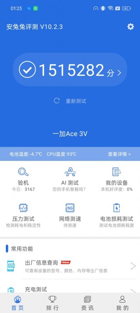 从结果来看,一加Ace 3V的安兔兔跑分为1515282分,已经十分接近第二代骁龙8的成绩,在当前中端阵营中属于妥妥的高水准,能为用户带来顶尖的性能体验。结合独家自研的「内存基因重组技术 2.0」和「焕新存储技术」的技术调优,以及首次搭载的OPPO旗舰技术「潮汐架构」,充分实现了软硬件的高效协同。