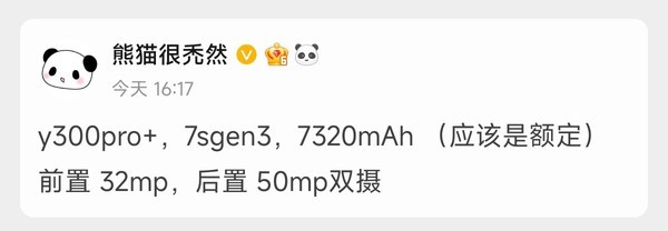 其他方面,根据此前曝光的消息,全新的vivo Y300 Pro+内置一块额定容量为7320mAh的超大电池。影像方面,该机将前置3200万像素自拍镜头,后置5000万像素双摄。除此之外,考虑到前作vivo Y300 Pro的相关外观配置细节,升级版的vivo Y300 Pro+预计在外观上变化不大,预计同样将采用全等深微四曲屏,拥有舒适的观感与握持体验,背部的后置相机模组为圆形。