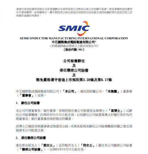 此外,其还于港股公告宣布,公司代理董事长、执行董事、首席财务官兼公司秘书高永岗博士已辞公司秘书职务,自2021年11月11日起生效,以在辞任公司秘书后专注于履行其作为代理董事长、执行董事兼首席财务官的职责。同时,委任联席公司秘书委任郭光莉女士及符梅芳女士担任本公司联席公司秘书(联席公司秘书),自2021年11月11日起生效。