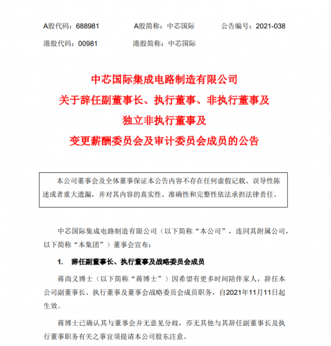【TechWeb】11月12日,中芯国际(688981)宣布:蒋尚义辞任副董事长、执行董事及战略委员会成员;梁孟松辞任执行董事,在辞任后将继续担任本公司联合首席执行官;周杰辞任非执行董事、薪酬委员会成员及审计委员会成员;杨光磊辞任独立非执行董事及薪酬委员会成员。