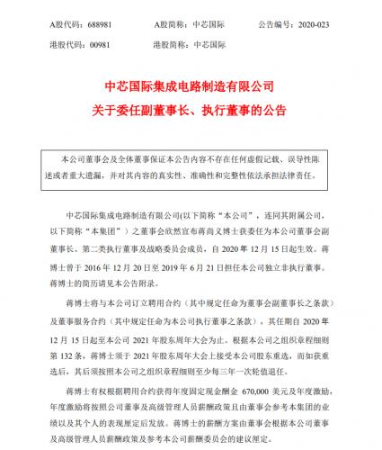 值得注意的是,现年75岁的蒋尚义于2020年12月15日被任命为中芯国际董事会副董事长、第二类执行董事及战略委员会成员。目前,蒋尚义在中芯国际本次任期尚未满一年。