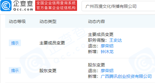 【TechWeb】企查查APP显示,近日,广州百漫文化传播有限公司发生工商变更,新增股东广西腾讯创业投资有限公司,此外该公司股东包含腾讯关联公司林芝利创信息技术有限公司、深圳市利通产业投资基金有限公司。