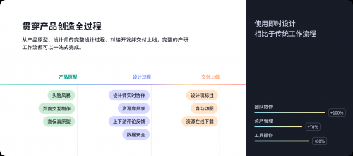 「即时设计」设计+协作的平台形态已经成熟,设计师的设计创作、交互动效,产品经理的页面跳转梳理,同产研团队的在线评审、打点讨论,以及给开发交付的切图导出、参数代码标注等功能需求现在皆可通过即时设计一站式完成,并且实时协同。而且利用团队文件状态标签、项目跟进和嵌套文件夹等独特功能,配合在线工具云端存储历史版本的优势,足以让任何一个产研团队最大程度地得到完善的数字资产管理和协同效率提升。