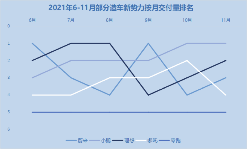 从1月的2002辆到11月的10013辆,在10个月的时间哪吒汽车交付量翻了5倍,并连续在8月、9月和10月排名造车新势力前三,同时本月的交付量与第三名蔚来相差不足千辆,表现势头强劲。