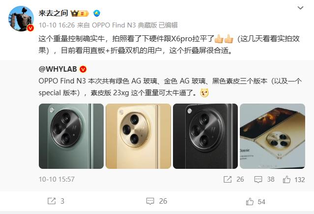 微博CEO王高飞在其个人账号“来去之间”上称赞道:“这个重量控制确实牛”“用直板+折叠双机的用户,这个折叠屏很合适”。在他眼里,OPPO Find N3很大程度上取代了直板机的体验,值得担当日常主力机。