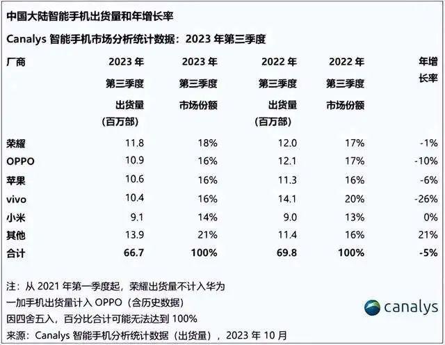 市场调研机构Canalys公布的最新数据中,国内市场第三季度出货量6670万部,市场销量同比下滑3%,OPPO出货量1090万部,由原来的第三名上升到第二名,但与去年同期相比,却下滑了10%。