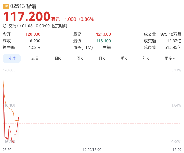【TechWeb】1月8日消息,今日大模型第一股智谱(HK:02513)正式挂牌港交所,开票股价报120港元,较发行价116.2港元涨约3%。随后涨幅即开始下降,截至上午10点,股价报117.2港元,涨0.86%。
