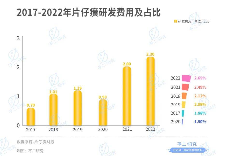 据片仔癀财报显示,片仔癀2017-2022年的研发费用率分别为1.88%、2.12%、2.09%、1.50%、2.49%和2.65%,2020年研发费用率仅1.50%。