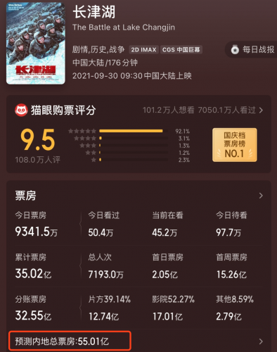 国庆长假结束后,《长津湖》票房势头已经回落。由于后续没有大片接档,估计《长津湖》放映时间不会短,其票房仍然有上涨空间。猫眼专业版预测,《长津湖》内地总票房将达到55.01亿,如果是这样,背后企业盈利无压力。
