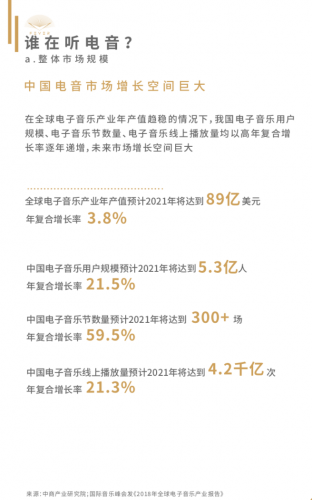电子音乐线上播放量将达4.2千亿次,90%的电音爱好者表示他们通过音乐类APP听电音,2021年全球电子音乐年产值预计将达89亿美元。
