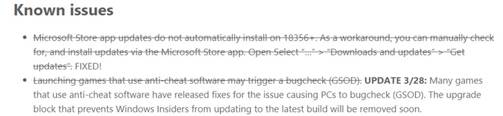许多使用反作弊软件的游戏已经针对导致PC出现错误检查(GSOD)的问题发布了修复程序。阻止Windows Insiders更新到最新版本的块将很快被移除。