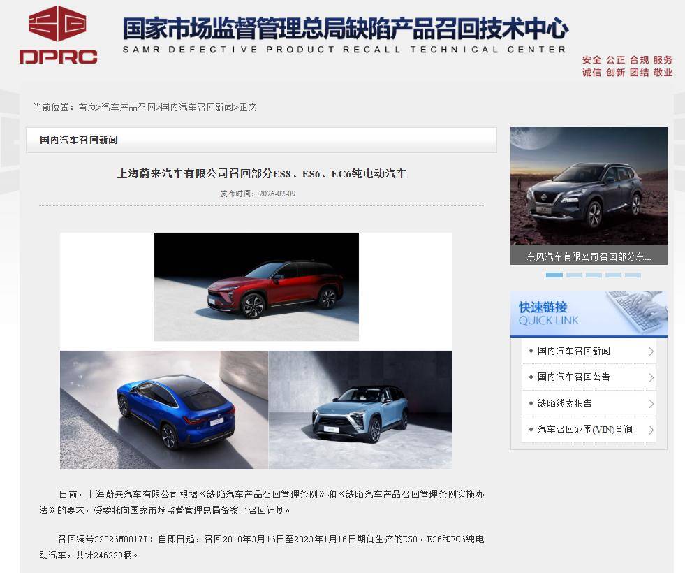 汽车行业从来不缺速度,缺的是在高速里仍然能稳稳地照看安全、成本、体验,三者同时不掉链子。就在2026年2月9日,国家市场监督管理总局发布一则召回通告,蔚来汽车(下同“蔚来”,NYSE:NIO、HK:09866)需要对246229辆车辆以软件升级方式实施召回。