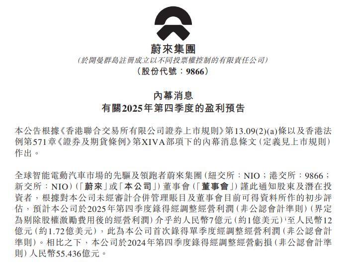 蔚来在2026年2月5日公告中表示,根据对其未经审计合并管理账目及董事会目前可得资料所作的初步评估,预计其于2025年第四季度录得经调整经营利润(非公认会计准则)(界定为剔除股权激励费用后的经营利润)介乎约人民币7亿元(约1亿美元)至人民币12亿元(约1.72亿美元),此为其首次录得单季度经调整经营利润(非公认会计准则)。