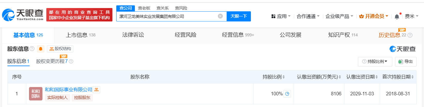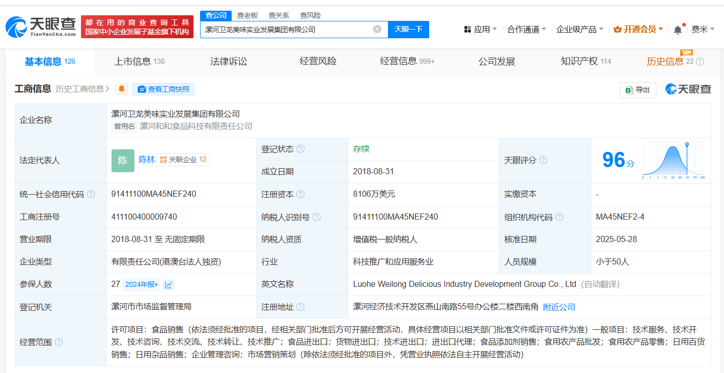 天眼查App显示,近日,漯河卫龙美味实业发展集团有限公司发生工商变更,注册资本由6606万美元增至8106万美元,增幅约23%。该公司成立于2018年8月,法定代表人为陈林,经营范围包括食品销售、食品进出口、货物进出口、技术进出口、进出口代理、食品添加剂销售等。