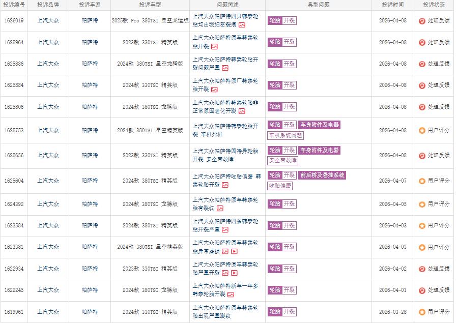 除了变速箱这一核心部件,车辆唯一接触地面的部件——轮胎,也成为部分车主反映的焦点。在第三方投诉网站上,针对帕萨特和途观L的轮胎投诉中,“韩泰”品牌的出现频率较高。车主反映的问题较为一致:轮胎胎面排水槽及胎侧出现不同程度的龟裂纹,有的车辆行驶里程仅1万至2万公里,轮胎花纹尚未明显磨损,却已出现较为严重的老化开裂现象。
