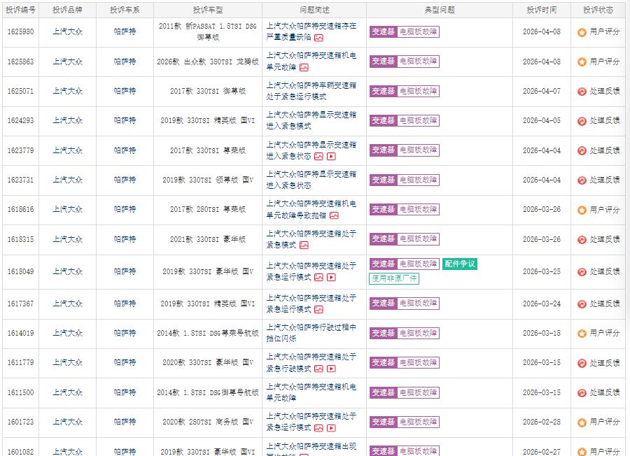 经记者查阅相关投诉案例,此类故障多指向变速箱机电单元(TCU)的传感器问题。维修后台常见的故障码为“P173500”。记者注意到,2025年4月中旬至今,关于帕萨特变速箱电脑板故障、无法挂挡的投诉较为密集。值得关注的是,这一现象并非仅限于老款车型——虽然2020年前后的车型反映较多,但2023款、2024款乃至2025款的新车中,也有车主提及变速箱顿挫、异响及控制单元故障。有分析指出,相关缺陷车辆的行驶里程呈现一定的提前趋势,从过去的10万公里左右,到部分车辆在3万至5万公里即出现类似情况,甚至有车主提车不久便遇到此类问题。